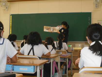 9月7日(水)の朝の時間に、4年生が、玉造絵本の会の方に読み聞かせをしていただきました。楽しい絵本や大切なことに気づく絵本など、3冊ほど読んでいただきました