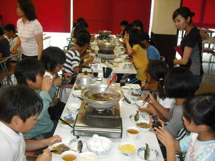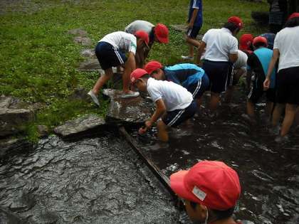 魚つかみでは、川の水は冷たかったですが、みんな夢中で魚を見つけてつかんでいました。つかまえた魚は、夕飯と一緒においしくいただきました。