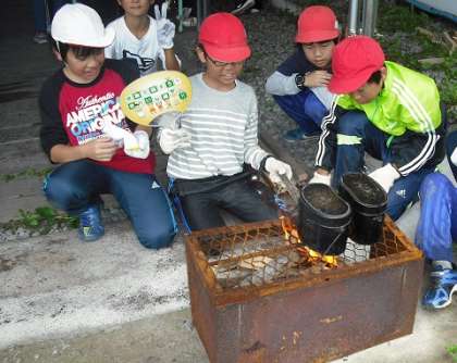 2日目は、朝から全員で鉢伏山に登りました。下山後、野外炊飯場でカレー作りに挑戦しました。どの斑も火をおこしたり、野菜や肉を切ったりと分担して活動し、おいしいカレーができあがりました。