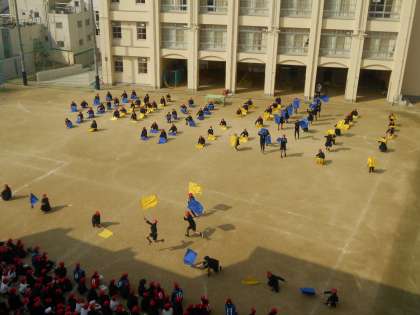 6年生は、この日のために練習してきたフラッグ演技で在校生にエールを送りました。また、「大好きな玉造小学校をきれいにして」という思いを込めて縫った雑巾を手渡しました。