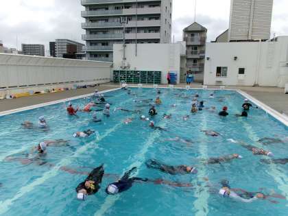 服を着て水に入ると、水着の時と比べて動きが困難になることを体感しました。