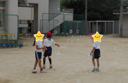 生活科の学習で、しゃぼん玉遊びをしました。うちわにしゃぼん液をつけてあおぐと、たくさんのしゃぼん玉が空高く飛んでいきました。