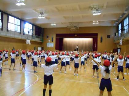 体育参観の団体演技の練習が始まりました。リズムにのって楽しく踊っています。暑さ対策に気をつけて、練習を進めていきます。