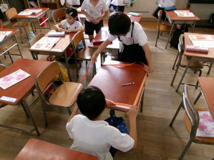 ペアやグループで紙テープを持ち、測りたいものの端に紙テープを当て、印をつけました。