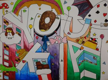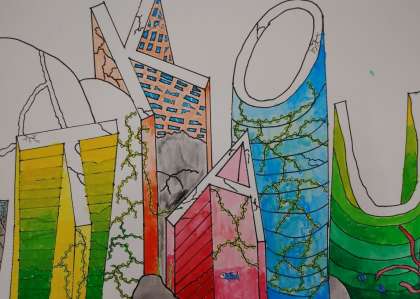 自分の名前の形をしたビルがある町。その町には、どんな生き物が住んでいて、どんなことが起こっているのでしょう。文字を立体的に表現して、その側面に窓を描くことで、そびえ立つビルにしました。只今、どの子も作品制作に夢中です。完成が楽しみです!