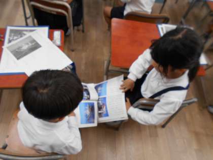 国語科で「いろいろなふね」の学習をしました。漁船の「やくめ」「つくり」「できること」を読み取って、のりものカードにまとめました。中央区内の先生が参観される中、意欲的に学習することができました。