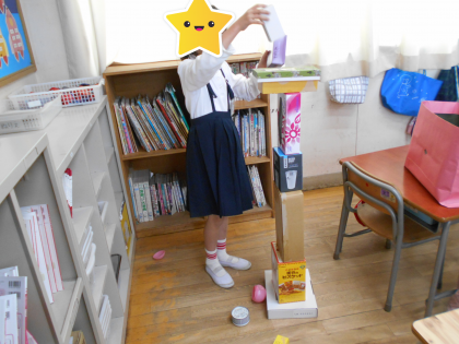 算数科「かたちあそび」の学習で、箱を高く積み上げました。高くするにはどのように積めばいいのかを考えながら、一人で積んだりグループで競争したりしました。箱の形、筒の形、ボールの形に分けられることを学習しました。