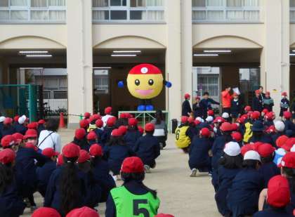 150周年のお祝いクイズやスペシャルゲストの玉ちゃんとのジャンケン大会、最後に校歌を歌ってみんなでお祝いをしました。