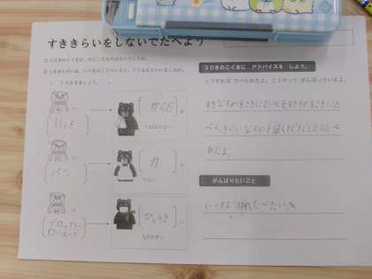 今回の栄養指導は、「すききらいしないでたべよう」についてでした。食べ物にはいろいろな働きがあり、いろいろな食べ物を食べると体によいことを学習しました。学習の最後に、好き嫌いをせずに給食を食べられるようになるために頑張りたいことを考えました。