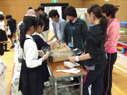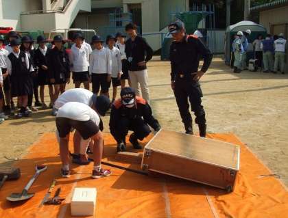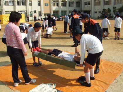 写真は上から「搬送体験」「救助体験」「炊き出しご飯のパック詰め体験」の様子です。
