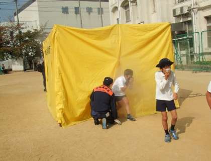 写真は上から、「防災のお話」「煙テント体験」「水消火器体験」です。