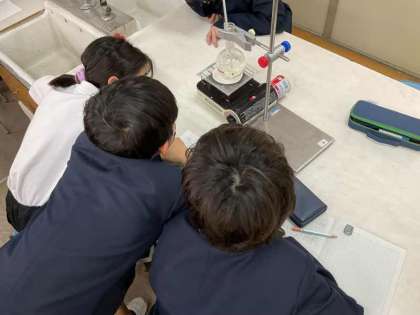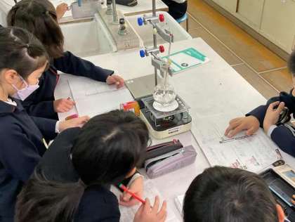 理科の学習では、水のすがたが温度によってどのように変わるかを学習しています。今回は、フラスコに入れた水を温めたときの変化をノートに記録しました。湯気が出たり、水の中から泡が出てくる様子に、子どもたちは大興奮しながら観察していました。
