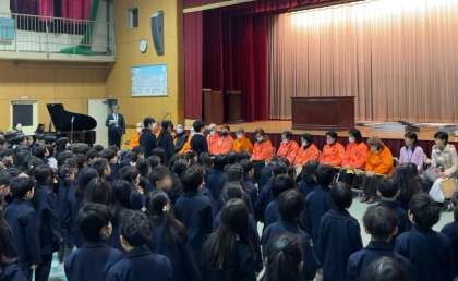 いつも登下校のとき見守って頂いている「玉造見守り隊」のみなさんと、楽しい絵本の読み聞かせをして頂いている「玉造絵本の会」のみなさんに、日頃の感謝の気持ちを込めて、ことばを贈ったり「ありがとうの花」を歌ったりしました。