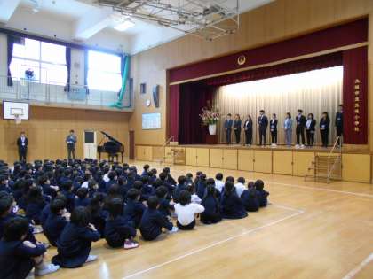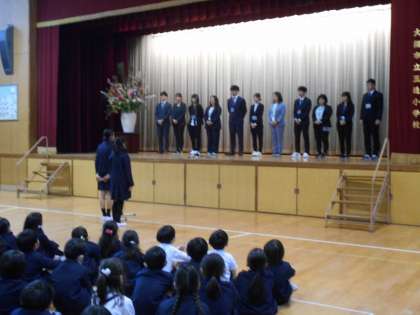 離任した先生と着任した先生の紹介を行い、代表児童が歓迎のことばで着任した先生を迎えていました。