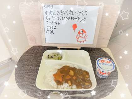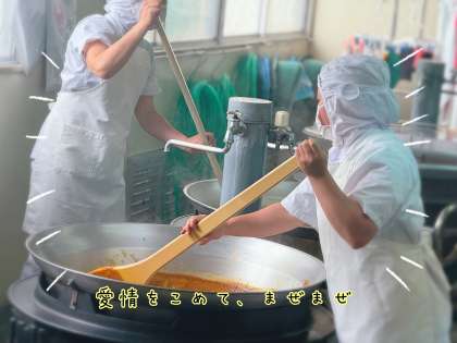 カレーがよりいっそうおいしくなるよう、給食室では愛情こめて、作っています😊