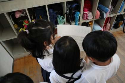 たてわり班で集まって、お店巡りの打ち合わせをしたりしています。