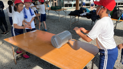 シャーベットづくりは活動班のみんなで協力して行います。オレンジジュース、みかん、砂糖をよく混ぜて、密閉できるステンレス容器にいれます。その容器を一回り大きな筒の中に氷と塩と共に入れます。ここから25分間転がしていきます。