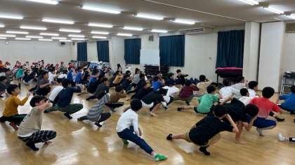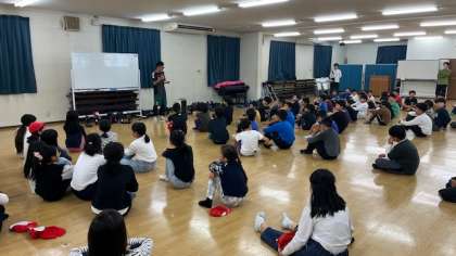 外の広場で朝のつどいをする予定でしたが、開始前に雨がぱらっと降っていていたので、多目的ホールに場所を変えて朝のつどいを実施しました。雨はすぐにやんで終わった頃には晴れていました。