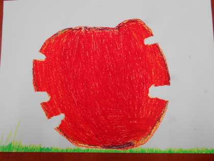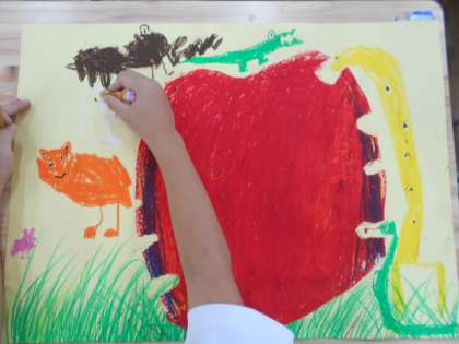違う色を塗り重ねたりんごのまわりに、動物を描きました。