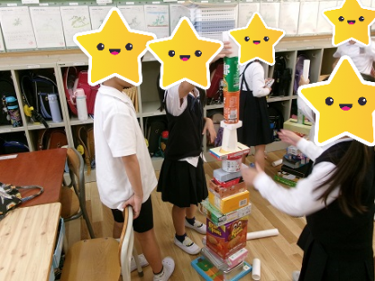 積める形と転がってしまって積めない形があることや、箱の大きさや向きに気をつけると高く積めることを学びました。
