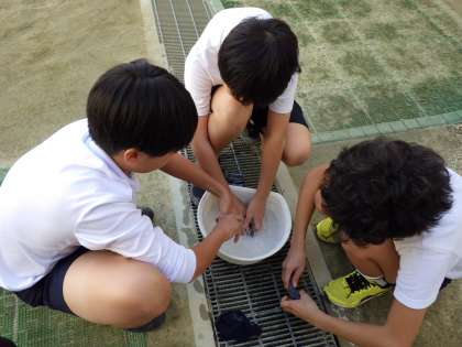 家庭科の学習で、洗濯実習を行いました。自分の靴下を、ゴシゴシ手洗いをして、洗濯の手順を学習しました。手洗いできれいにするのは、思った以上に大変そうでした。