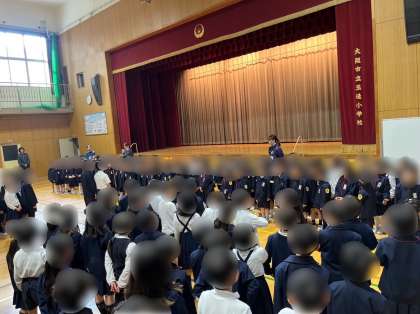 本日、入学した1年生と2〜6年生との対面式がありました。児童代表からは、1年生に歓迎の言葉を伝えました。1年生は緊張しながらも、たくさんのお兄さん、お姉さんと対面することができました。