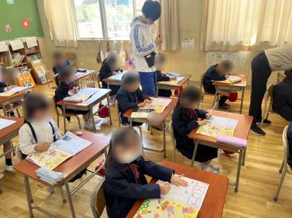 1年生は国語の学習でひらがなを練習しています。毎日、新しいひらがなを習います。子どもたちは練習ノートに丁寧に練習していました。