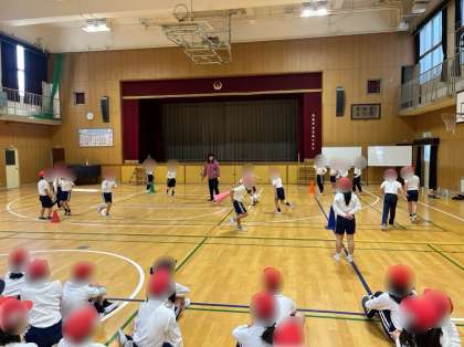 3年生は体育の学習です。じゃんけんをして、勝つと次のコーンへ、負けると真ん中のコーンを回る「じゃんけんすごろく」というゲームで走の運動をしました。