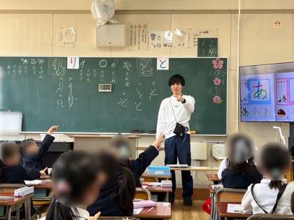 1年生は今日も新しいひらがなを習っています。読み方を教わり、今度は指書きを練習します。指書きの後は、そのひらがなを使う言葉を集めました。