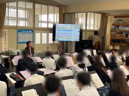 6年生は音楽で旋律や響きの変化をとらえて演奏する学習です。「マルセリーノの歌」という曲を音階で歌いながら、旋律をつかみ、木琴、鉄琴、リコーダーのパートに分かれて合奏をしました。