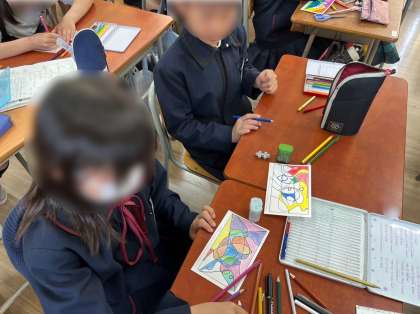 5年生は図工の学習です。自由に引いた5本の線が交わってできた図形に色を塗っていきました。となり同士が同じ色にならないように工夫しながら色を塗りました。