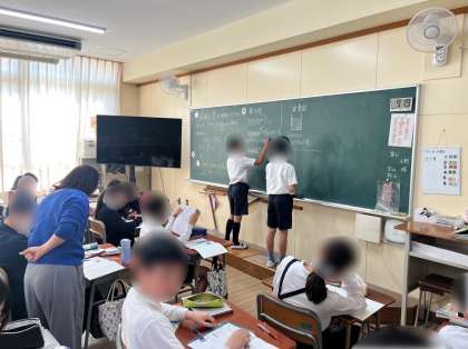 6年生は算数で分数÷整数の計算の仕方を学習しています。子ども達は線分図や液量図を使って自分の考え方をわかりやすく説明することができました。