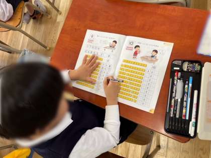 1年生は算数であといくつで9になるか学習しました。子ども達はブロックの数を数えながら、1と8、2と7のようにいくつといくつで9になるかたしかめていきました。
