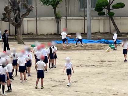 5年生は体育の学習です。週末は雨が降りましたが、無事上がり、運動場で幅跳びを練習しました。しっかり助走をしながら踏切位置を意識して跳びました。