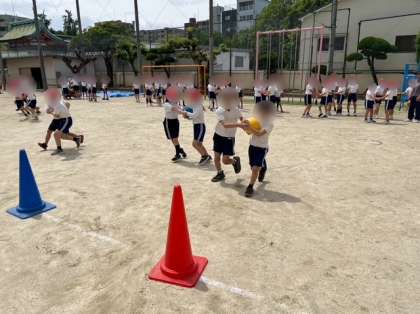 3年生は体育の学習です。コーンを使って、普通に走ったり、2人組になってボールをはこんだりと色々な折り返しリレーに取り組みました。