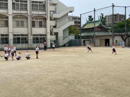 1年生は体育の学習でかけっこをしています。地面に先生が引いた水線の上をバランスを取りながら走り、コーンを折り返しました。