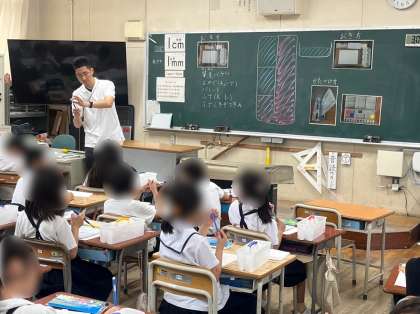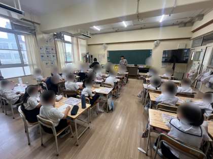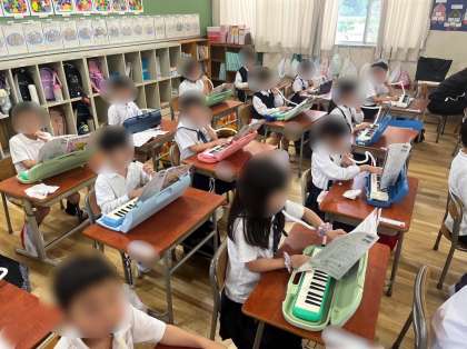 1年生は音楽の学習です。「さんぽ」の曲に合わせて鍵盤ハーモニカを練習しました。最初は、「ド」の音だけの練習ですが、楽器の音が鳴るだけでも、1年生にとっては大きな発見です。