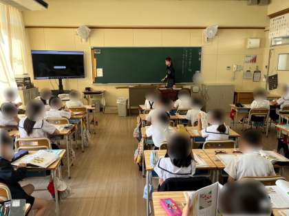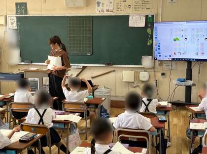 1年生は国語の学習です。ひらがなを書く練習も終わり、今度は使い方について学習しています。「お」と「を」、「え」と「へ」のように同じ発音でも、表記が違うひらがなの使い方を学習しました。