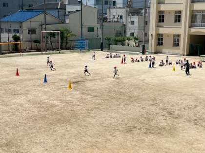 1年生は体育の学習です。運動場の遊具を使って遊んだ後、リングをバトン代わりにして、折り返しリレーをしました。