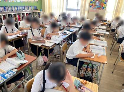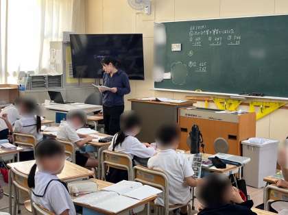 5年生は算数で小数のわり算を学習しています。小数点はあまりのどこにつければよいか注意しながら筆算に取り組みました。