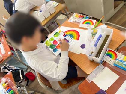 2年生は図工で絵の具を使ってわくわくレインボーという作品を描いています。7色の絵の具を使って、わくわくする虹になるように彩色しました。
