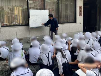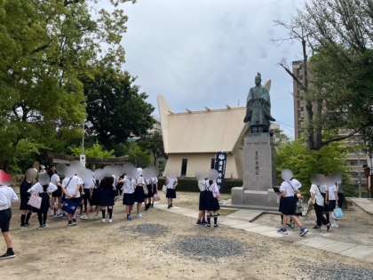 本校にも稲荷神社の名前にもある「玉造」という名前は、昔、この地で玉を加工して作っていたことに由来しています。そこから、徐々に大阪平野が形成され、聖徳太子、豊臣秀吉・秀頼に至るまで歴史に名を残した人々がこの地と関わってきたことを教わりました。たくさんの貴重なお話をしていただきありがとうございました。