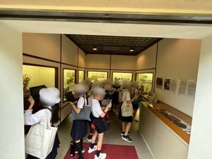 6年生は、歴史学習で玉造稲荷神社に来ました。境内にある難波玉造資料館を見学し、古代の勾玉や装飾品を見学しました。その後、神社の鈴木さんからお話をうかがいました。