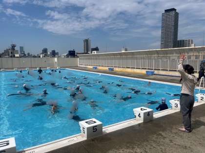 3年生はプール水泳の学習です。顔をつけて、くらげ浮きやだるま浮きをしました。水慣れをしたあとは、けのび、バタ足、クロールを練習しました。