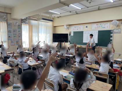 1年生は算数の学習です。今日もイラストを見ながらたし算の問題作りをしました。イラストの色々な数に着目して問題を作ることができました。