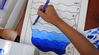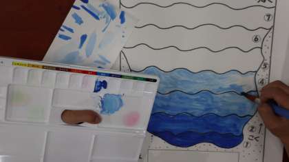 2年生は図工科で絵の具を使う練習をしています。子ども達は、絵の具を使うのをとても楽しみにしています。今回は、青色の絵の具を使ってで海を描きました。青色に水を少しずつ加えていくことによって、海の深さを表しています。水の量がだんだん増えていくと、