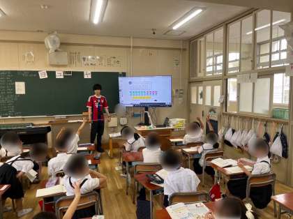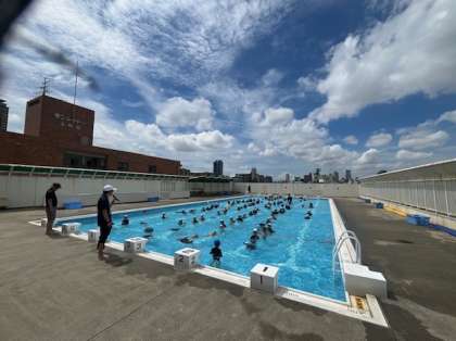 2年生はプール水泳の学習です。今日は、お天気も良くプール日和です。顔をつけてみる練習やだるまうきなど水に慣れる学習を行いました。