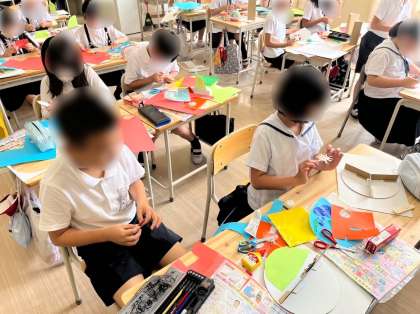 3年生は図工で「うごいて楽しいわりピンワールド」の制作をしています。円台紙にわりピンをつけ、楽しく動く作品になるように工夫を凝らしました。