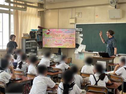 4年生は外国語活動の時間です。ニノ先生と、曜日の英語表現を教えてもらい、1週間の予定をいれて、曜日クイズをしました。