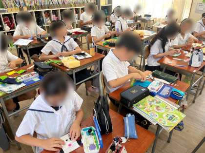 5年生は家庭科の学習で小物づくりをしています。フェルトを使って、自分の好きな小物をデザインして縫い合わせていきました。